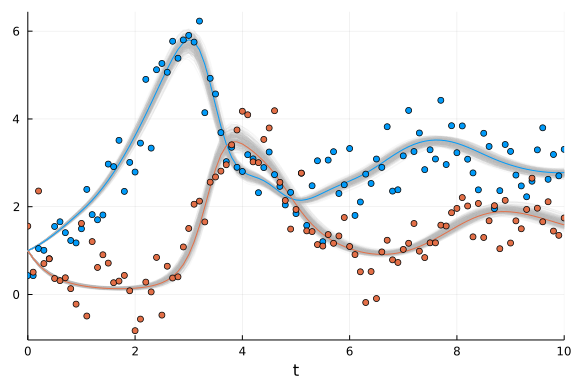 Therefore, we write the Lotka-Volterra parameter estimation problem using the Turing @model macro as below: