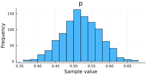 After defining the model, we can approximate the posterior distribution by drawing samples from the distribution. In this example, we use a Hamiltonian Monte Carlo sampler to draw these samples. Other tutorials give more information on the samplers available in Turing and discuss their use for different models.