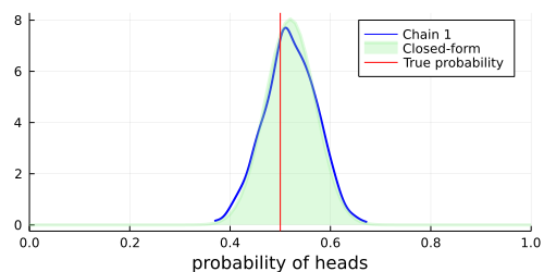After finishing the sampling process, we can visually compare the closed-form posterior distribution with the approximation obtained with Turing.