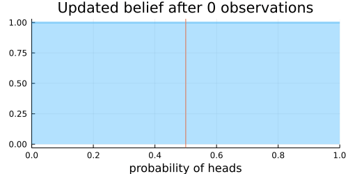 Assume that we are unsure about the probability of heads in a coin flip. To get an intuitive understanding of what "updating our beliefs" is, we will visualize the probability of heads in a coin flip after each observed evidence.