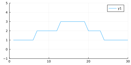 plot(y; xlim=(0, 30), ylim=(-1, 5), size=(500, 250))