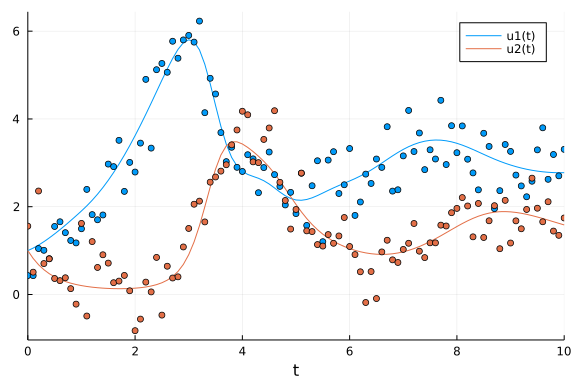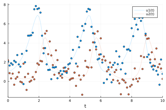 scatter!(sol.t, odedata'; color=[1 2], label="")