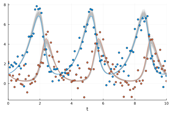 Previously, functions in Turing and DifferentialEquations were not inter-composable, so Bayesian inference of differential equations needed to be handled by another package called DiffEqBayes.jl (note that DiffEqBayes works also with CmdStan.jl, Turing.jl, DynamicHMC.jl and ApproxBayes.jl - see the DiffEqBayes docs for more info).