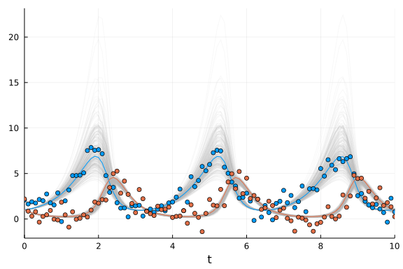 Therefore, we write the Lotka-Volterra parameter estimation problem using the Turing @model macro as below: